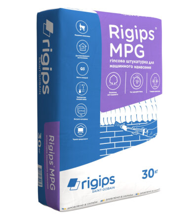 Rigips MPG — це сучасна професійна гіпсова штукатурка, що наноситься машинним способом шаром 6-30мм і дозволяє вирівнювати стіни і стелі всередині приміщень. Допускається також ручне нанесення. Зменшена витрата до 9 кг/мкв/10 мм.