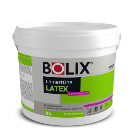 BOLIX CamertOne Latex – це латексна фарба для фарбування внутрішніх стін та стель у приміщеннях, що часто використовуються (наприклад, коридори, вітальні або кухні) та в громадських закладах (включаючи, зокрема, навчальні заклади, служби охорони здоров'я, лікарні, заводи, ресторани). Можна наносити на цементні, цементно-вапняні та гіпсові штукатурки, гіпсокартонні плити та бетонні основи, шпалери з паперу та скловолокна. Підходить для фарбування дрібних елементів із каменю, цегли, деревини та матеріалів на основі деревини. Утворює матове покриття без відблисків з підвищеною стійкістю до змивання більшістю миючих засобів та дезінфекції. Має підвищену стійкість до утворення мікротріщин у барвистому покритті. Не містить органічних розчинників.